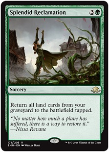 As someone who has regularly played and extolled the virtues of Planar Birth, this is an awesome card. It puts all of those lands from your graveyard right back on the battlefield where they belong. And this plays into a lot of archetypes as well. If you have a bit of a self-milling theme, this works. Discard theme? This works! What about a sacrifice theme? This works! Do you have a bunch of fetch lands? This works! Is land destruction a thing in your metagame? This works! Playing mass land destruction yourself? This works! The simple fact is that this card works in so many Green-centric builds and shells that it’s going to be a major star of casual tables moving forward. Because, at the end of the day, it just works.