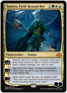 4 mana for a four loyalty planeswalker that can really own the board is something highly useful moving forward. Take a look under the hood — Her first +1 ability is just awesome. The next time two target creatures would deal damage, you draw a card. And this lasts for a turn, so there are two ways to use it. Offensively, before you attack, to draw some cards from creatures that are about to hit. Or defensively. Use her to inspire two opposing creatures, and now their controller has to make a tough choice on their turn. Attack you and let you draw some cards? Attack Tamiyo and do the same? Attack another player for cards for you? Or just let them stay back for a turn so no one else is drawing cards? That’s a powerful problem you are giving them. And then you get her second ability to lock two annoying cards down for a spell, including one additional turn after you just tapped them. Slow tap. So you get a powerful multiplayer friendly card drawing option, and some useful tapping of problems like opposing creatures. And note that her stuff works in tandem. Tap down some blockers for a few turns, swing. Next turn swing with her +1 giving you two extra cards. So, she’s quality. The only thing keeping a good Moonfolk down is that she’s three colors, and that’s hard for some formats (Commander) or folks to easily run.