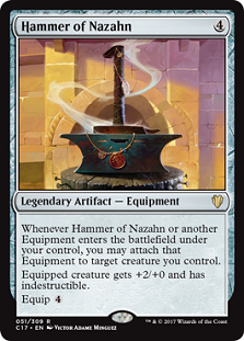 You have the Hammer as well. It does two things very, very well. First, the value of that free equip of itself or any other equipment that arrives cannot be overstated. You are going to equip Hope of Ghirapur, right? Duh! Then you get indestructible and bigger in the front too. Smash away my friends, smash away. Don’t forget that this will auto equip your Battle-Axe copies as well!