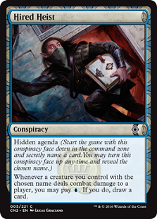 Hired Heist — One of the new spins on Conspiracies this time around are these color-matters ones. Hired Heist is a useful addition to your deck, if you are running Blue. The last time around, I remember stuff like 1-drop Typhoid Rats doing good work keeping folks away and being used for Conspiracies. These ones work with the common creatures, since you have the best chance of getting a few in the draft. I remember once having four Custodi Squires. You could use Illusionary Informant as a 2-drop that flies and gets the draft trigger as well. Vaporkin is more beater that blocker, but plays a similar role. The Blue mana to draw a card when you smash is a lot better than the simple Loot effect I figured this card would be, and adds a powerful reward for the right deck.