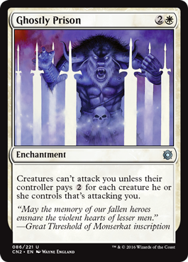If you don’t like Ghostly Prison, I don’t know that you’ve ever played multiplayer. The sheer quality and power of this, and similar, effects is quite appealing. It places a break on folks coming your way with multiple creatures, often forces folks into an uncomfortable, “Do I attack or do I play stuff?” question, and usually just turns people to attacking others. The sheer potency of this card cannot be denied. And it’s been a while since we’ve seen a batch hit the streets. (In case you care, it’s also a color-shifted card, much like Hail of Arrows. It came from Propaganda).
