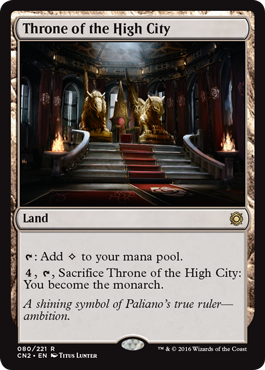 Throne of the High City — Drawing cards is one of the major keys to winning Magic. This is particularly true at a multiplayer table where the game goes longer and people are outdrawing you. So having a colorless way to draw a card like Throne of the High City is pretty cool. But there are some barriers here. First of all, you have to tap a bunch of mana and sacrifice the land. You can’t use it to draw cards on someone else’s turn, in response to something, and you can’t use what you draw that turn, as you have to wait to pass the turn before you draw. Why would you want to bother with such a set of restrictions in most decks? Other than places where being the Monarch gives you some added bonuses, I just don’t see it usually. Granted it requires a little more mana and Blue to sacrifice, but I almost never run Blighted Cataract. About the place that I want this is Abe’s Deck of Happiness and Joy, but that’s a quirky 3000+ card highlander deck with all of the colors.