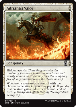 Adriana’s Valor — Conspiracies are cool. The common cycle of Hidden Agenda ones with a color outlay give you another powerful option you can draft later when you have the option. Pay a White mana, and indestructible-tize your attacking creature. It only has to be the one drafted. I am really digging it as a potential option for Commander Cube, where you can make your attacking Commander indestructible for one White mana – which works for a lot of stuff.