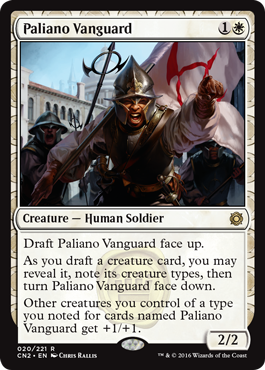 Paliano Vanguard — . . . It’s no Paliano Vanguard. It’s a Grizzly Bears already in progress. You can do the same draft trick you did with Noble Banneret, only here you care about creature types. Draft a Solider or Human or Cleric or whatever and reveal it, and now your Vanguard pumps them all up like a lesser version of a Glorious Anthem on a stick. And you can draft and flip some dopey creature card late that has the right intersection of creature types even though you won’t play it. Vanguard for the win.