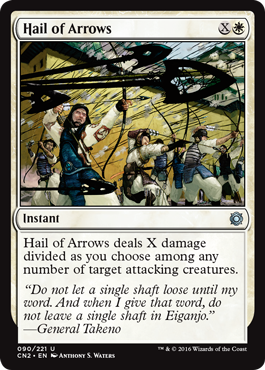 I’ve always been a fan of Hail of Arrows, and as soon as it was printed, I tossed it into my decks to blow people out. As a fixed, and color-shifted version of Rock Slide, it’s a great combat trick that kills a lot of attackers, gives you an interesting angle to take out creatures, gives you potential card advantage, and is maximally flexible. In multiplayer, it’s a big hit, and as a White instant, it gets past a lot of the typical annoying protections, like Akroma, Angel of Wrath. The Hail Storm Begineth