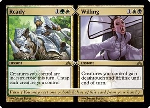 Ready // Willing has a unique status due to the fuse ability. To this day, it remains one of the best combat tricks you can unleash. Ever. Period. Full Stop. There are three reasons. Untapping and indestructible is awesome. The untap puts all of your team out for blocking while the indestructible lets you block with impunity. That alone is sexy. Deathtouch gives you the ability to surprise kill anything you block and lifelink even lets you gain some seriously amazing life while you are at it. And you don’t have to run this as a combat trick. You can just cast Ready to untap your tappers to tap them for more effects or for indestructible after a Wrath of God is put on the stack. You get the idea. This is a very flexible tool. Bring it!