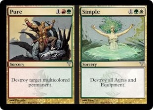 Forget Pure. Don’t pay any attention to it. This card is about Simple. How often do you see equipment at the kitchen table? Right! I hear you. All the time. All of it. And Simple is basically a Shatterstorm for equipment (and auras as well, in case you care.). You can see just how powerful a card like that would be, right? I like a split card like this that can provide card advantage, and given just how many cards you’d take out, it’s strong. And it’s so easy to build around or find a home for. Now recall Pure. It’s a Vindicate against any multicolored permanent. And we see those lots at the kitchen table, including Commander where almost every deck has a multicolored leader. Pure // Simple is a powerful card that you’d best not forget any longer.