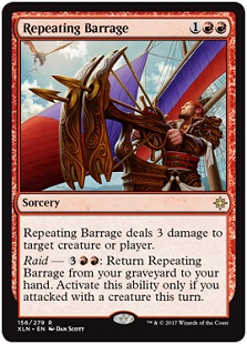 On the other hand, Repeating Barrage can be brought back in your second main phase, which is when you have perfect information. But it requires you to have attacked. You won’t always be able to recur it back for hand for more burning. Now, the raid part that keeps you from only playing it is not a trigger, but a condition of using the ability. But in play, this is both an advantage and a disadvantage. Only after you have attacked, but as many times as you want past the attack.