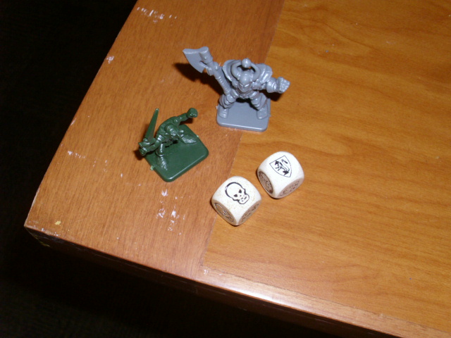 Do you see it? First of all, I included a miniature of a Chaos Warrior and Goblin there, and again, they are of a similar size and concept. But I also tossed a pair of dice on the table . . . a pair of dice with a . . . skull and shield . . . hmm . . . (The dice are only slightly different, with three skulls, two white shields, and one black shield—good guys block with white shields, and bad guys block with the black shields.)