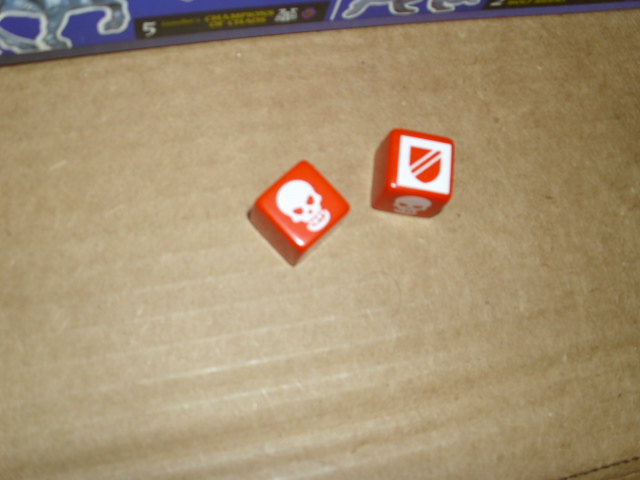 Remember those dice with the three skulls and two shields—the ones that would show if there was a hit or not? Here are dice from my HeroScape game . . .