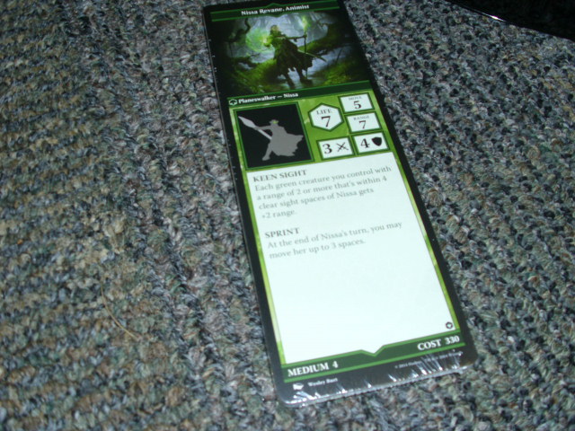 This is one of the cards that comes with the box, and this is for our good Zendikari Planeswalker Nissa. There are a few elements of this card that are important to see—here, we have her stats, her abilities, and a few other things, such as cost, attached. This is her basic card.