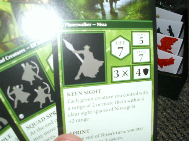 After cracking these cards open, let’s take a look at how some of the effects work, including this line of sight. This card is straight out of HeroScape. Again, we’ll talk about that in a while. Look at the card’s silhouette of Nissa. If you want to know if one of your characters can see another, you set up your eyes behind the dot on the character’s card (usually on its head). Can you see any part of the card that you are wishing to target? It just has to be the part not shaded white. You see Nissa’s card has her weapon shaded white—so you cannot draw a line of sight to that, you can only draw line of sight to anything else.