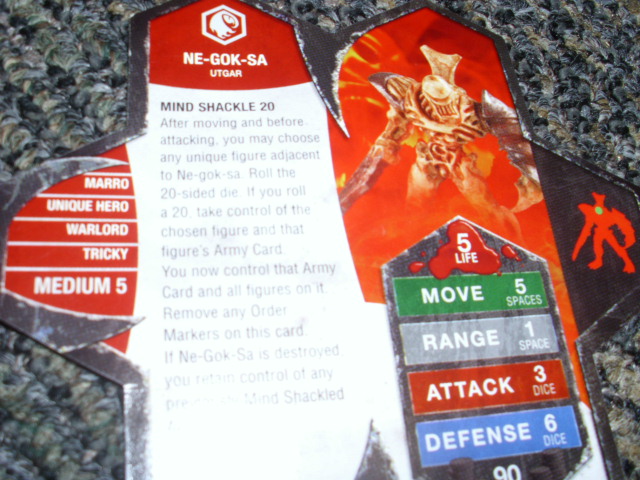 This is a card for a character in HeroScape. Note the huge similarities. Bot characters have attack and defense dice, health, range, and move. They have abilities on the card, they have a points cost to purchase, they have a size, and so forth. They even have the exact same line-of-sight guide, and here, the whole body is shaded red, so you can draw line of sight to any part of Ne-Gok-Sa to hit it.