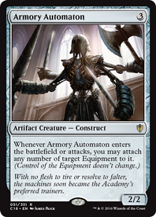 So it looks like we aren’t going to be getting good equipment again. Vehicles are the new thing. I have not added in a piece of newly minted equipment into my Cube since Blade of Selves in last year’s Commander product. I’m unconvinced that Conqueror’sFlail has the chops to make the cut for my Cube. Nevertheless, I do have a Boros Equipment archetype, as well as some equipment enablers in the Cube. So the Automaton brings some heat against equipment, despite the fact that my equipment section is set. I still have all of the powerful and expensive equipment, the full cycle of Swords of Feast or Famine and stuff like Umezawa's Jitte, Skullclamp, and Batterskull. I see a space for this anyway. Now I was thinking about pulling Steel Wall for this. Steel Wall serves a few purposes — it’s a cheap artifact 1-drop for pro-artifact decks. And it’s a good early defender for the various control builds. But it’s not that highly desired or needed by anyone. And while I’ve always had a personal fondness for Steel Wall (in fact I once called it the 2nd best common of all time for multiplayer), it’s time for it to go. Time for Armory Automaton to head in.