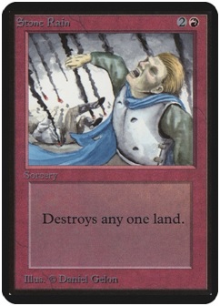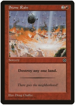 The Portal Second Age version has amazing art by Doug Chafee, as well as a fun quote. But I prefer the quote of the Tempest Stone Rain which I think accurately portrays the perils of this card well. Stone Rain is iconic and shows the power of rock and stone.