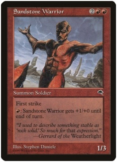 Take a look at that thing! This Warrior of Stone that is clearly made of the rock is ready to brawl. He's amid a rocky area, and his card and art are killer. The card itself was amazing as twinning the pumpable ability with first strike is just lethal and threatens almost all dorks out there. Now, I'm not a fan of the flavor text. I also hate what the reprint did to this card.