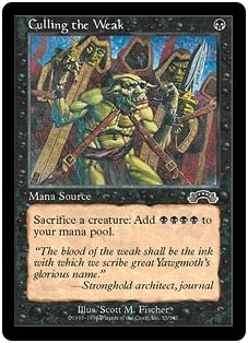 This is Hatred. Now, Hatred came out at the same time as a few powerful 1-drops like Sarcomancy and Carnophage, as well as fast-mana with the reprinted-and-still-legal Dark Ritual or the new Culling the Weak. The goal of this powerful Suicide Black deck was to force out a fast Hatred Kill on the 3rd turn with Hatred, a powerful dork hitting, and fast mana. It could get a turn two kill with a Carnophage or Sarcomancy Zombie and then two Ritual effects.