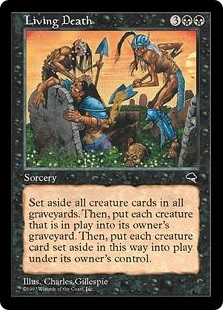 Living Death - This spell can be used to take you from losing to winning in one sweeping moment. You can be behind on creatures, and then when you cast this your foe has their one dead creature back to your four or five dead dorks back, and now you win. It's a big game swing.