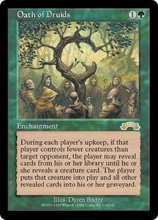 Oath of Druids was a key factor in the game, both then, and now, and has made an appearance in multiple formats, such as Legacy and even Vintage. If it's been legal in that format, then it's had decks in it. One of the key answers against it was to play creature light deck, or to wait to play them for maximum effect. It will run Verdant Touch or Forbidden Orchard to give your foe a dork, and then thus, activate Oath for that Akroma, Angel of Wrath/Darksteel Colossus/Blightsteel Colosusus/Sliver Queen/Verdant Force/Spirit of the Night/Emrakul, the Aeons Torn or whatever else happens to tickle your fancy. It's going to win quickly, and that's what matters. It dominates the table, and it loves cards that either want a nice filled graveyard (such as threshold) or that can restock your deck to keep you from decking yourself (such as Gaea's Blessing).
