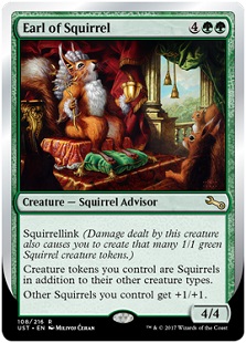 This is another card that strikes my Black-border fancies. Squirrellink is an ability that could easily cross over from this silver-bordered world. You could also use it for #10 above, by the by, and if you did go wide, could I suggest Battle Cry as a good follow up? This feels like an intentional take on fixing Deranged Hermit. For one more mana on the front end you lose echo, and you get a 4/4 beater instead of a 1/1. And you pump other Squirrels just like the Hermit of Squirrels does, as well as turn other tokens to Squirrels for pumpage. And you can make some as you deal damage with your awesome Advisor of Squirrels.