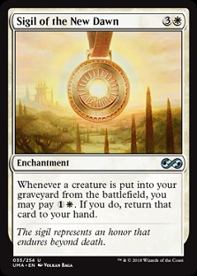I really like Sigil of the New Dawn, and it's getting downgraded from Rare to Uncommon for y'all. Enjoy it! I used it as recently in my real life Bear Beats Commander deck in October. It's never been reprinted since it arrived on the casual and multiplayer scene in Onslaught. Isn't that sad? I think so! Well now we can change all of that for folks! Here is the enchantment. Enjoy it. It's going to help you in many ways. Want to sacrifice a dork and then recur it? Want to bring back something that your foe killed? Want to drop Day of Judgment and have enough mana for a dork or two to head back to your hand? It's going to help you from multiple angles. Sigil of the New Dawn works.