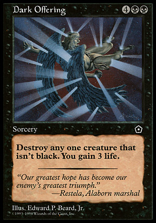 Dark Offering – The angel gets snuffed out. And you gain some life, too! Sure, the card sucks compared to stuff like Sever Soul, but this is about the art, and the angel’s impending lightshow . . . er, death . . . is really fun to see.