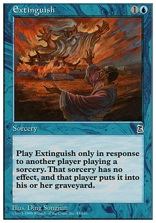 Extinguish – This Counterspell variant has great art from the Portal Three Kingdoms set. I love the fire being dispelled in the background, making it more of a literal extinguishing than the previous art from the card, which looked at it more as a mystic extinguishing of a wizard’s eldritch power.