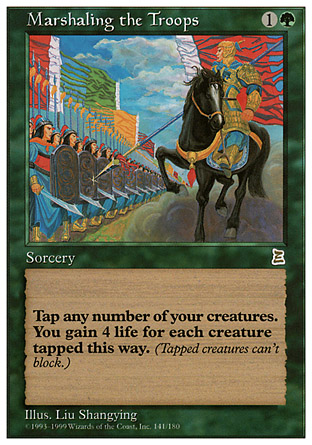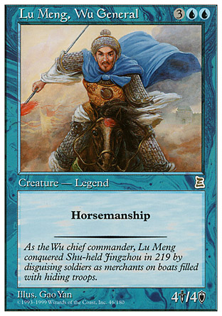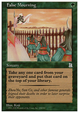 False Mourning – I love how a lot of the cards that were made in Portal Three Kingdoms reflect existing Magic concepts, but instead have a real-world feel (such as Deception instead of Mind Rot). False Mourning makes perfect sense tactically, and the art with the banner flown and the gate is nice. I wish we might have seen a different scene (such as a funeral scene), but this image has a grim feel to it that I like.