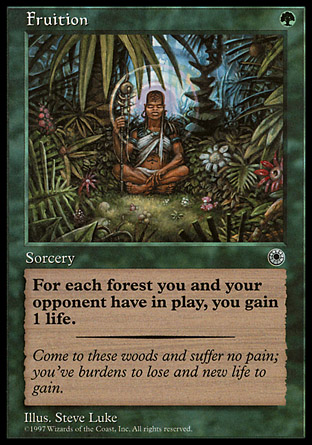 Fruition – Steve Luke was among the reasons Mirage block was so much fun. His Mind Rot art from Portal was so powerful that despite being reprinted in nine subsequent core sets, they always used his art. He does Abyssal Hunter, Coral Fighters, and Scalebane's Elite. He has several Portal works of note, such as Bog Raiders and Devastation, but it is this janky Fruition that is among the best of his twenty-nine pieces in Magic. You have great colors and the monk–shaman guy in the middle all meditating and such. This art deserves a better home than this card.
