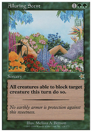 Alluring Scent – Melissa Benson was one of the iconic artists in the early days of Magic. Some of my favorite art from that era (see Syphon Soul) came from her brush. Her Shivan Dragon was among the original combinations of great picture and great card. Alluring Scent is another of her works that looks really nice, but it's been banished to this sucktastic card.