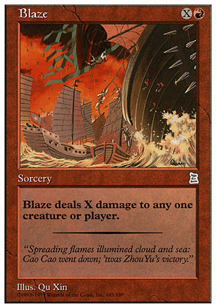 Blaze – This bad X spell was reprinted a lot, but two works were never seen again. I love the red Blaze from Portal Three Kingdoms because it shows red blowing up boats. Usually, when you see red burning blue's stuff, it’s a Drake. Here, it’s boats on the water—and the art is good (it's part of the story of the Red Cliffs Battle). Take a look at the Portal Second Age art while you are at it—it’s another great piece that was sadly not reprinted. Why they chose to use the first Portal’s art and Seventh Edition art again and again is beyond me when these two images were both better by far.