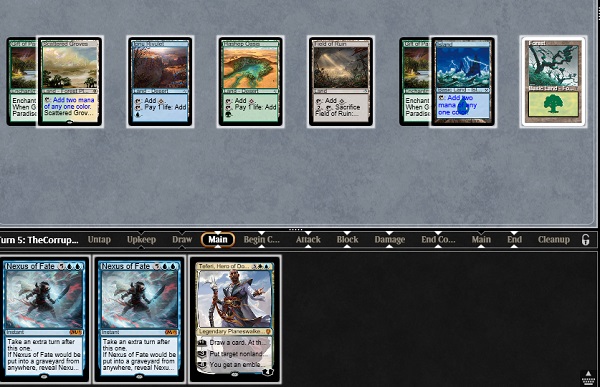 One of the most difficult things about the deck to recognize is how to use your mana efficiently, not just in terms of numbers but also in terms of colors. I've certainly lost games online because I wasn't as efficient as I could have been, and as a result, as a single card draw away from winning the game. Teferi, Hero of Dominaria is a part of the strangeness of figuring things out properly, because the oddity of being able to cast Nexus of Fate as an instant can mean that you'll be able to use Teferi's untap to good affect at the end of a turn, which can mean that you could cast one of the many 5-drops in the deck and Nexus of Fate at a mere ten lands -- but this is actually doable at even less lands depending on the number of Gift of Paradise that you have!
