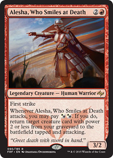 Here’s a creature that references Alesha, Who Laughs at Death but that cannot be resurrected by her ability.