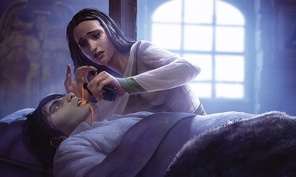 Then he came back as an undead scourge, cursing her name. She had given up all decorum for him, broken all the rules to save his life. Now his corpse screamed for her death. Her anguish fractured away the girl's trust, blackened her innocence, and cauterized her heart with pain. That much hurt could've killed her, if she had let it. The agony could've bowed and broken her. Instead she saved herself, Planeswalked to Innistrad, and became a woman strong enough to never feel so helpless again.