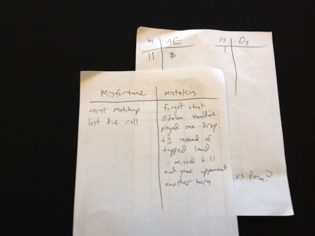 Notice in the second paper to the right that I’m also keeping track of how cards are performing in my deck. Each game, I consider which card I’d rather have drawn. After the tournament, I’ll take all these records home to my deck notes. I do this for science!—and to see trends that’ll increase my understanding as to how to improve.