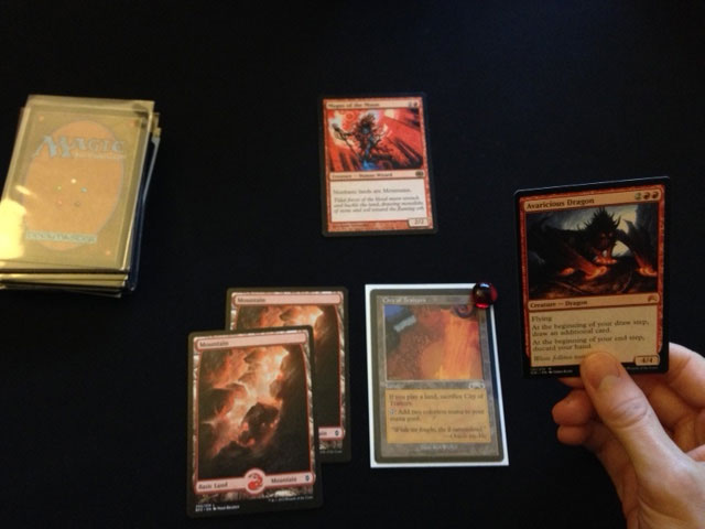 I am all too happy to remember that Blood Moon is reddening my opponent’s lands and blazing away all his or her non-perfect colors, but I sometimes forget it also applies to mine. This can lead to play mistakes that would be hard to forgive. With Magus of the Moon on the battlefield, my three lands of Mountain, Mountain, City of Traitors could no longer cast Avaricious Dragon.