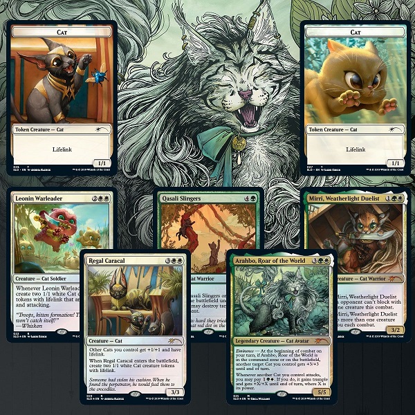 The above Regal Caracal can be found hissing alongside four other elite cats with new art designed to give you the warm fuzzies. If you feel a compulsion to play all of them together, I am here for you with an all-cat Oathbreaker deck. In this new multiplayer format, everyone starts at twenty life, making attacking with cats a more reasonable strategy. In addition, kittens are great at distracting enemy Planeswalkers. Each player starts with a Planeswalker and signature spell in their command zone, instead of a legend. You can play the signature spell (instant or sorcery) as long as your Planeswalker is on the battlefield, and everything is taxed two more each time.