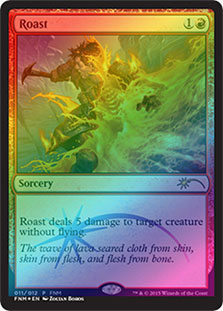 The promo of Roast also deserves a mention. Here, the damage is conceptualized with a lava flow. It is even clearer why only ground creatures can be targeted. A pair of wings will take you over the deluge of molten rock. The more you know.