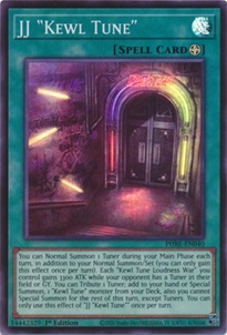 For Spells, we have the Field Spell JJ "Kewl Tune" as well as a Quick-Play Spell Kewl Tune Synchro. The field spell leads you into any Kewl Tune Synchro monster that you want since it gives you an additional normal summon of a Tuner each turn. You can also tribute a Tuner to add or special summon 1 Kewl Tune monster from your deck. Having the extra bodies in rotation extends your Synchro plays and helps with your Synchro Monsters' effects. Its last effect gives each of your Kewl Tune Loudness War 3300 ATK while your opponent has a tuner in their field or GY.