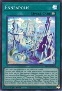 Enneacrafts receive their own field Spell, Enneapolis, that is perfect for their Flip effect shenanigans. Up until now I haven't mentioned the shared Pendulum effect the monster has, which is each time a monster is flipped face-up, place 1 E.C. Counter on an Enneacraft card(s) in the Pendulum Zone. The Field Spell allows you remove these counters during the End Phase and deal 900 points of damage for each. Play your cards correctly and all that effect damage might just steal you the game.