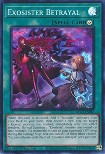 We've got two new cards that point toward Exosister Martha turning to the dark side. Exosister Betrayal lets you add two Exosisters from your deck to your hand then discard one card making it a great way to start your turn. Then there's Exosister Karmael, Martha's new XYZ form that can set an Exosister Spell/Trap from the Deck, GY, or Banishment.