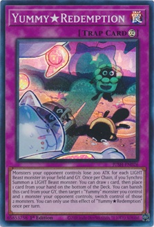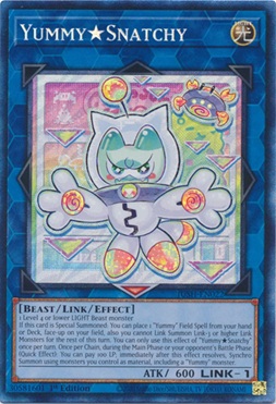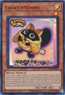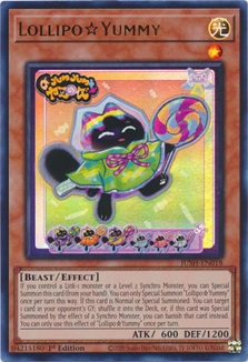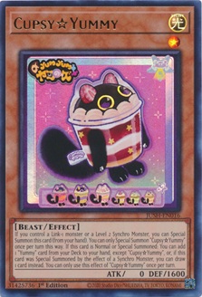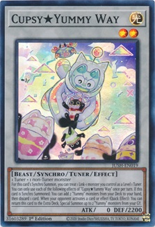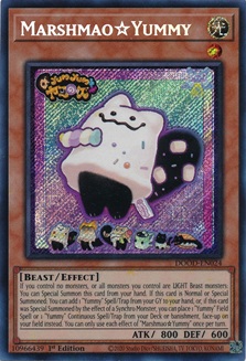 Yummy is a Synchro-based combo strategy that revolves around the four main deck monsters, Cupsy Yummy, Cooky Yummy, Lollipo Yummy, and now Marshmao Yummy. Each of the original 3 monsters have a Level 2 Synchro counterpart in Cupsy Yummy Way, Cooky Yummy Way, and Lollipo Yummy Way. Marshmao Yummy is your free extender. Finally, there's the Link-1 playmaker of the deck, Yummy Snatchy.