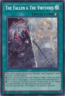 While this new structure deck is mostly a reprint deck that catches players up with the current Branded lore, there are a couple of new cards to enjoy. The first is the new Spell card, The Fallen & the Virtuous. As the namesake of the deck, this card is a perfect new addition to compliment the Branded playstyle. The effect is that you send 1 monster that mentions Fallen of Albaz from your Extra Deck to the GY, then either target 1 face-up card on the field and destroy it. Or if you have an Ecclesia Monster in your field or GY, you can target 1 monster in either GY to special summon it to your field. The versatility is nice because you can use the card's first effect to either get rid of one of your opponent's problem cards or destroy your own monster to dodge effects like Effect Veiler or Infinite Impermanence. Also, similar to MirrorJade the Iceblade Dragon, the cost of the card's activation is to send from your Extra Deck to the GY, which cannot be negated. So, at the very least you're likely to benefit from the sent monster's End Phase effect. Lastly, the card is always treated as a "Branded" and "Dogmatika" card, so it becomes searchable by a few other cards.