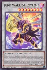 Ideally, you'll want to have or bring back Scrap Warrior when you summon the new boss monster Junk Warrior Extreme. Junk Warrior Extreme lets you to reborn as many level 2 or lower monsters as possible from your GY. You can also banish it when it destroys a monster by battle to Special Summon 1 "Junk" Synchro Monster from your Extra Deck. Do this in combination with "Scrap Fist" and the original Junk Warrior can get absolutely massive for a potential OHKO attack.