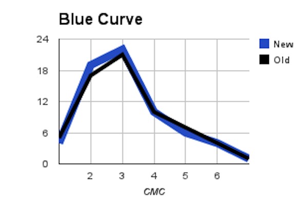 Blue remained its 60%/40% creature–spell balance, which is right where it wants to be. Blue’s curve also remains similar to its old form even though it has gained additional 2- and 3-drops. In the future, I will look for some solid 4-mana spells as potential inclusions.