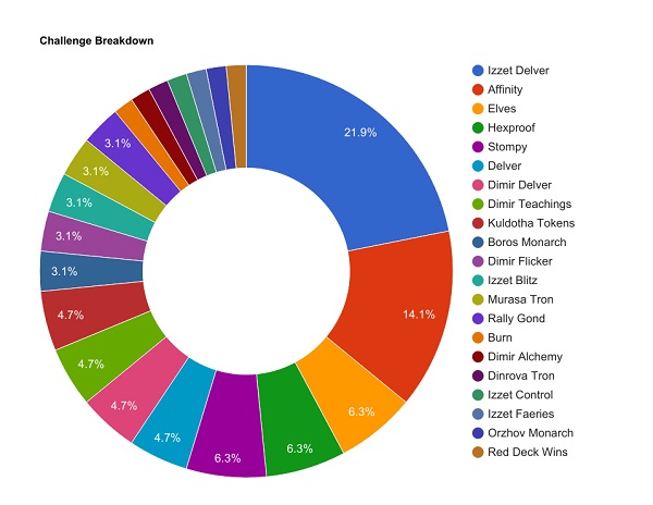 Before getting too deep in the weeds I want to take a look at some broad strokes. Across both Top 32s (which represent approximately the top third of each tournament) there were 21 different archetypes. Out of these 14 different decks appeared more than once. The most popular archetype was Izzet Delver which made 14 appearances between both events. Izzet Delver also dominated the Top 8 of the first Challenge with three copies in the Top 4 including the eventual winning deck.