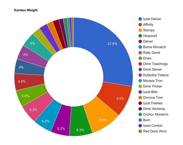 decks clocked in with 9 appearances. Three of these were the more tempo oriented Dimir Delver deck, using Delver of Secrets and Gurmag Angler to apply pressure with a light removal and counter suite to dictate the pace of play. The Dimr Alchemy deck looks similar except that is eschews the early pressure of Delver of Secrets for a more robust control game thanks to Forbidden Alchemy. The Innistrad common allows the deck to play a wide variety of answers while also fueling its endgame in Angler. Dimir Flicker is next slowest on the speed scale, trying to grind the game to a halt so it can win with Chittering Rats — Ghostly Flicker — Archaeomancer lock. Finally there is Dimir Teachings which uses the powerful tutor – Mystical Teachings – to try and answer every threat. The decks are the two ends of the spectrum – Delver and Teachings — both performed best with three copies each. This tells me that it is probably better to embrace being either the aggressive Dimir player or the true control mage when playing this color pair. For the control element I think Forbidden Alchemy decks may be better suited to the metagame going forward since their namesake can find any card and not just Instants or creatures with Flash.