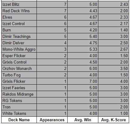 Again, Affinity presents an interesting case. It has the worst average Wins and average K-Score of any qualifying deck, the only one where the K-Score is sub 2. This was hurt by the June 18th event where Affinity had a 3-3 finish and three 4-2 finishes. At over 17% of all Affinity finishes, this had a negative impact on the decks stats. However that does not take away from the fact that Affinity still struggled in the other Challenges, likely due to how strong hate is against the deck.