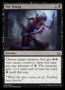 The Black duo work very well together. Die Young means that any deck that is hoarding counters can turn the spell into a slower Tragic Slip. Stapling a bonus onto a slightly more expensive Night's Whisper that can then convert said gravy into something else later (on top of the cards drawn) opens up tons of possibilities. I cannot wait to see what other ways we can use Energy and am excited at the opportunities the mechanic presents.