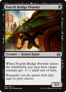 Now this card is very good! If you are generating energy in other ways you don't even have to attack with it, just untap with it. It's also a very good sideboard card for control decks if the control mirror ever becomes a thing. Menace is a great keyword to have on this thing. This could easily slide into a B/R aggro deck that has spells like Harnessed Lightning and the such. Turning your Harnessed Lightnings into "draw a card and lose one life" is nothing to scuff at, especially when they aren't doing anything in the matchup you're in. Keep an eye on this one, I have a feeling it might make some Black/x aggro deck good.